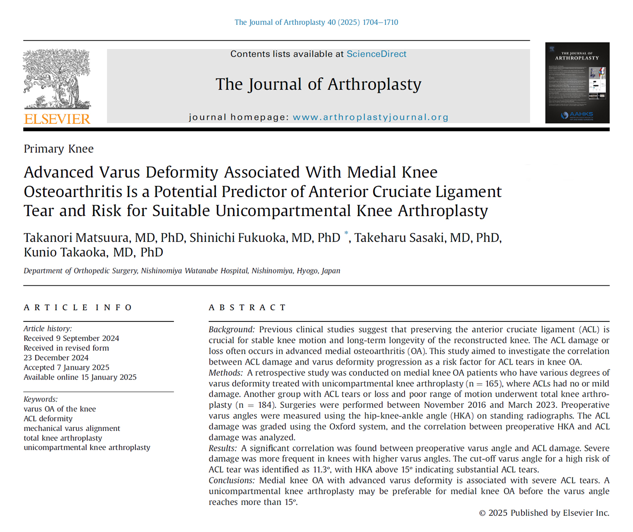 当院整形外科医師の論文が The Journal of Arthroplasty に掲載されました!