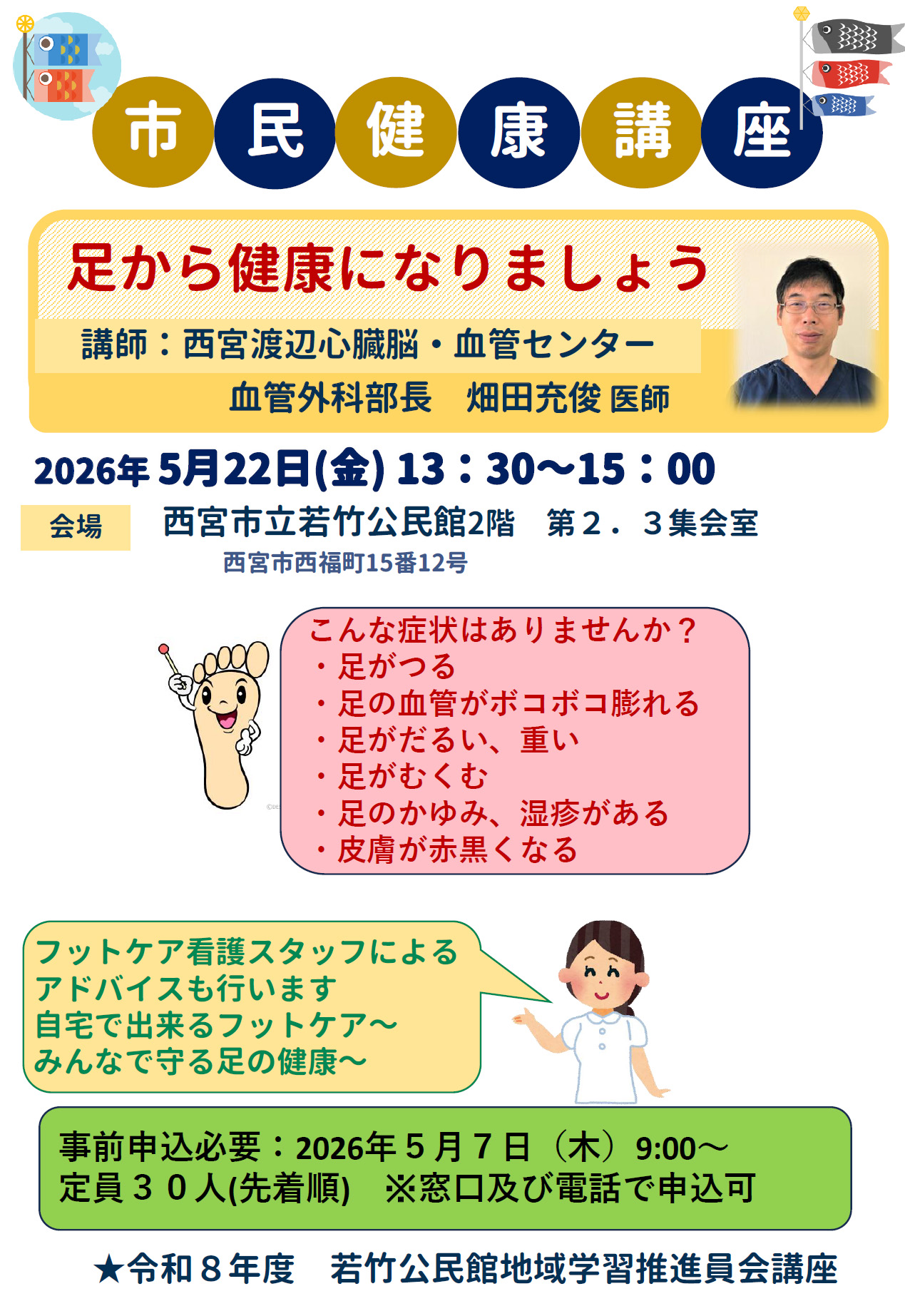5月22日(火)13時30分~15:00 若竹公民館にて市民健康座『足から健康になりましょう』のお話があります